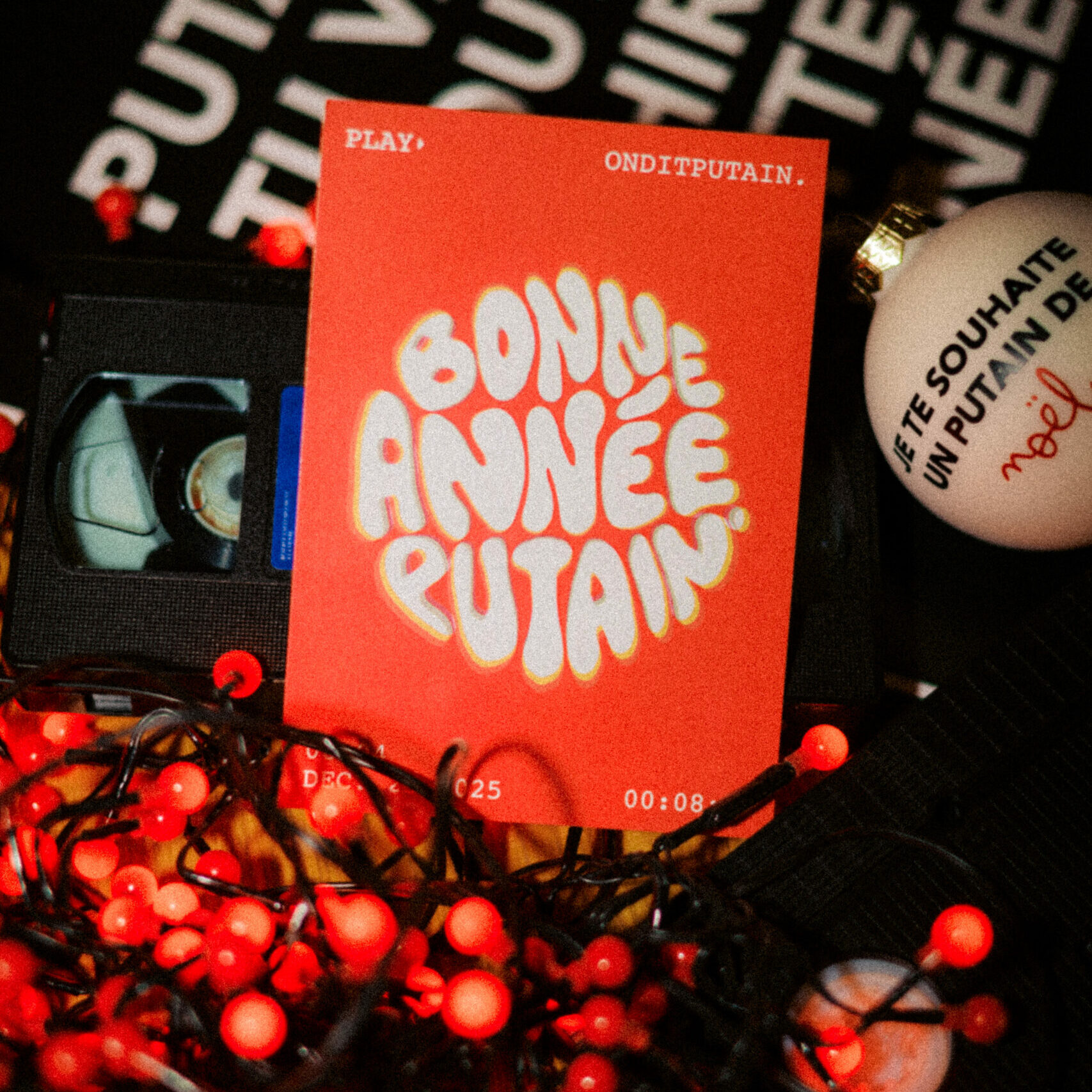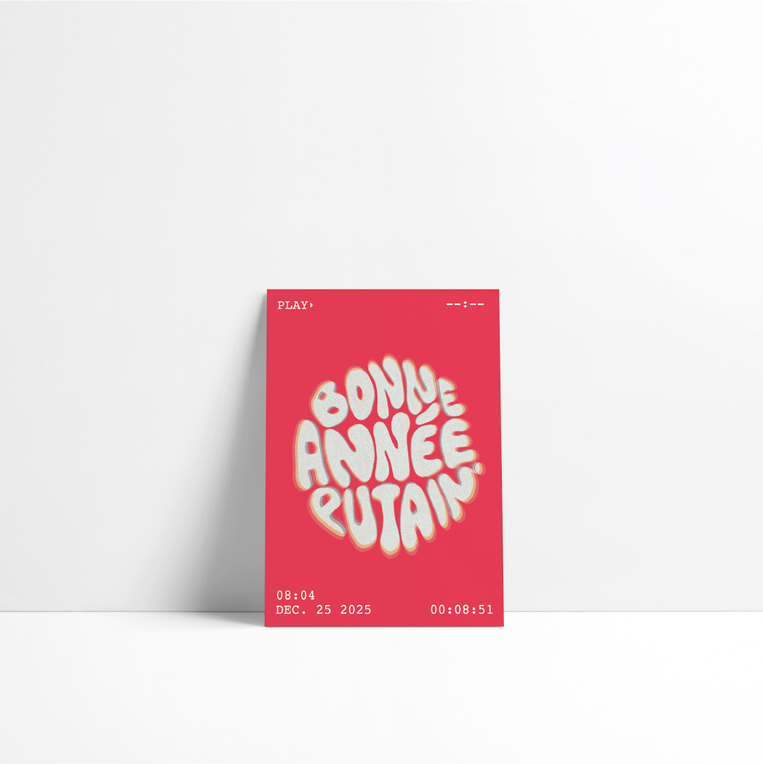 La carte Bonne année putain. célèbre les débuts d’année imparfaits, les résolutions bancales et les beaux projets qui naissent dans le chaos.