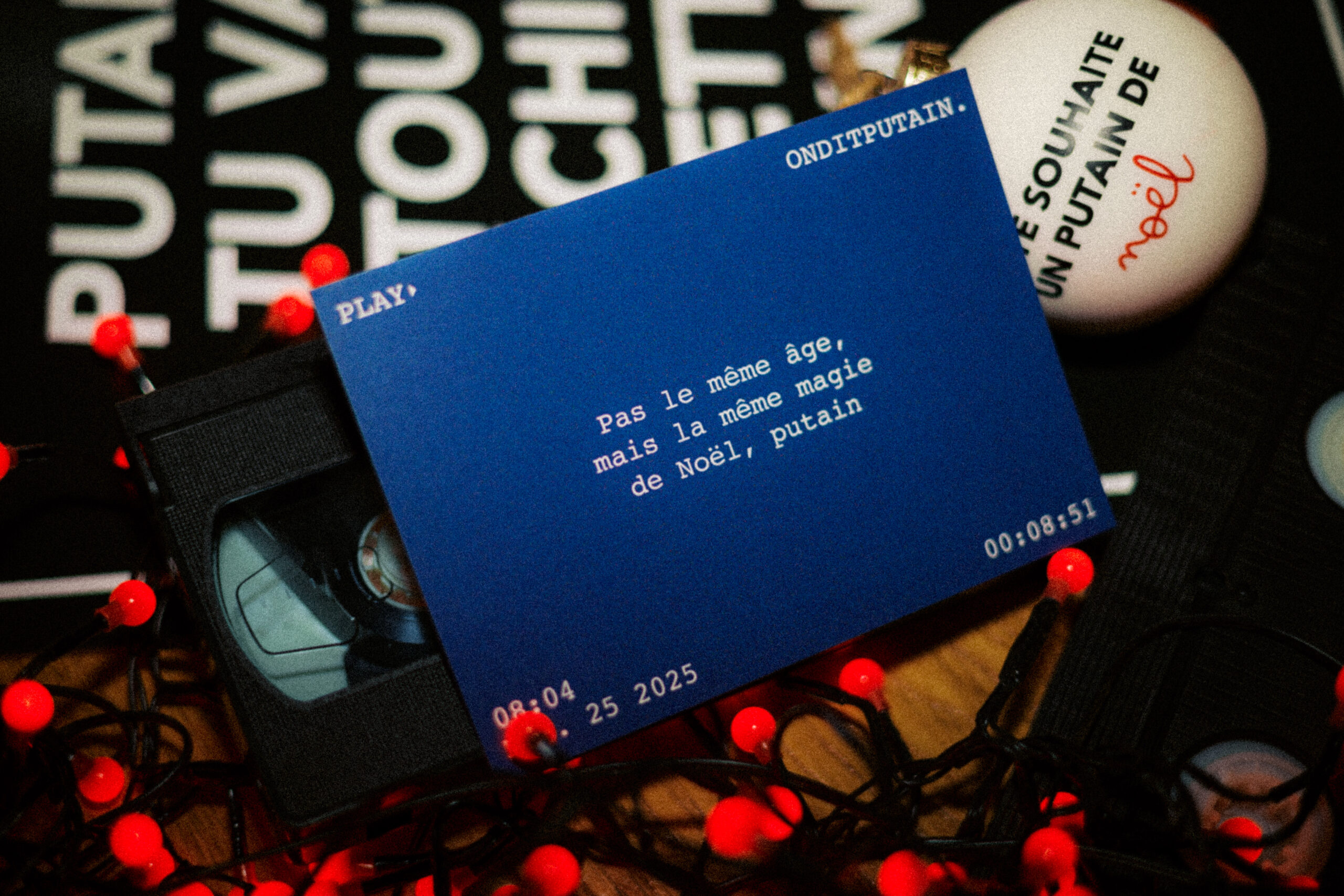 Une carte qui mixe nostalgie et esprit de Noël. Ici, pas de différence d’âge qui tienne : gamin, ado ou presque trentenaire, la magie de Noël frappe pareil, et le message aussi, putain. Avec son look rétro 90s, façon VHS qu’on ressort du grenier : typographie pixel, effets légèrement “glitch” et couleurs saturées façon vieux magnétoscope, et toujours ce ton franc, drôle et tendre qui fait sourire tout le monde.